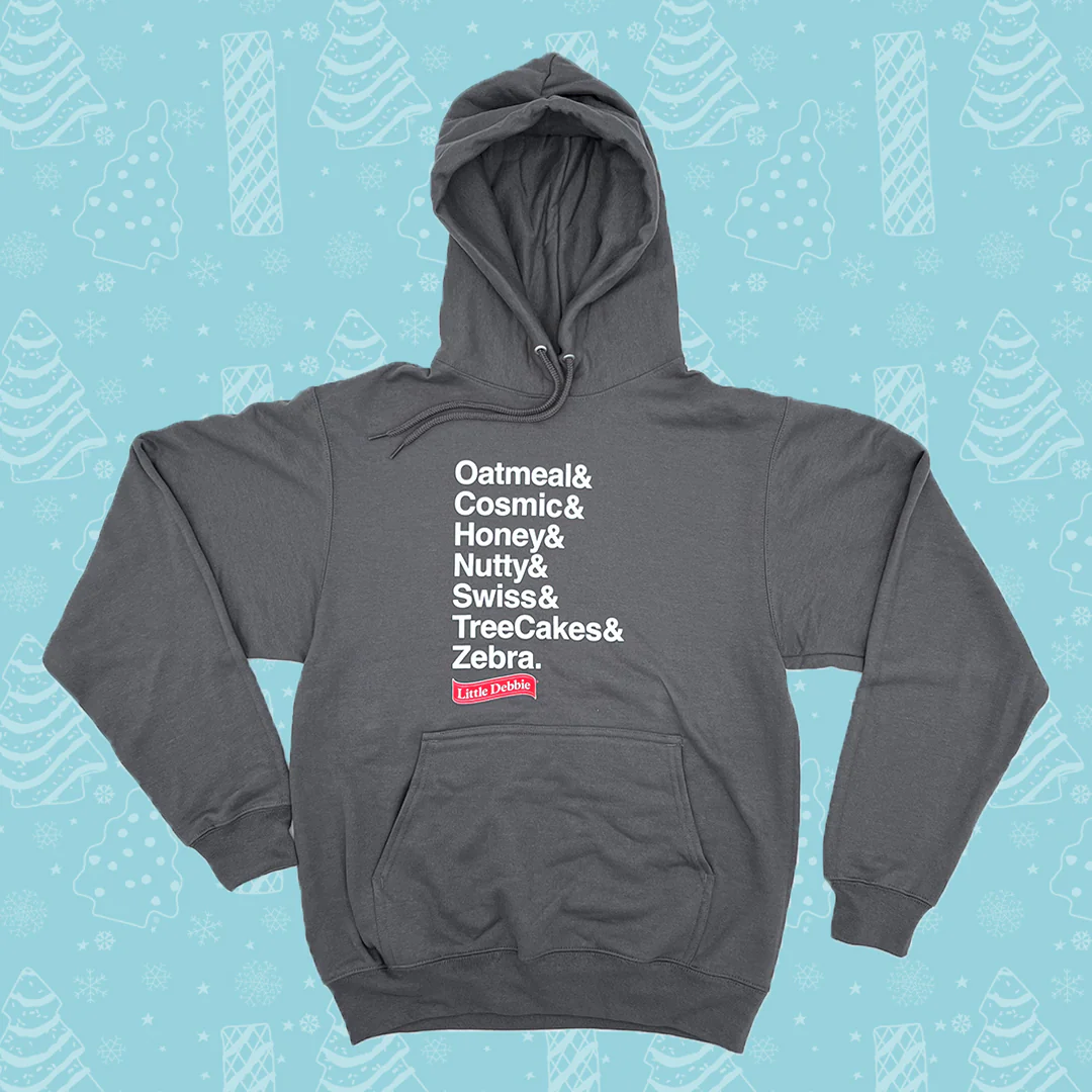 Set against a muted heather gray backdrop, the hoodie showcases a roster of iconic Little Debbie treats. From the wholesome Oatmeal to the zany Zebra, it's a wearable ode to snack-time legends.